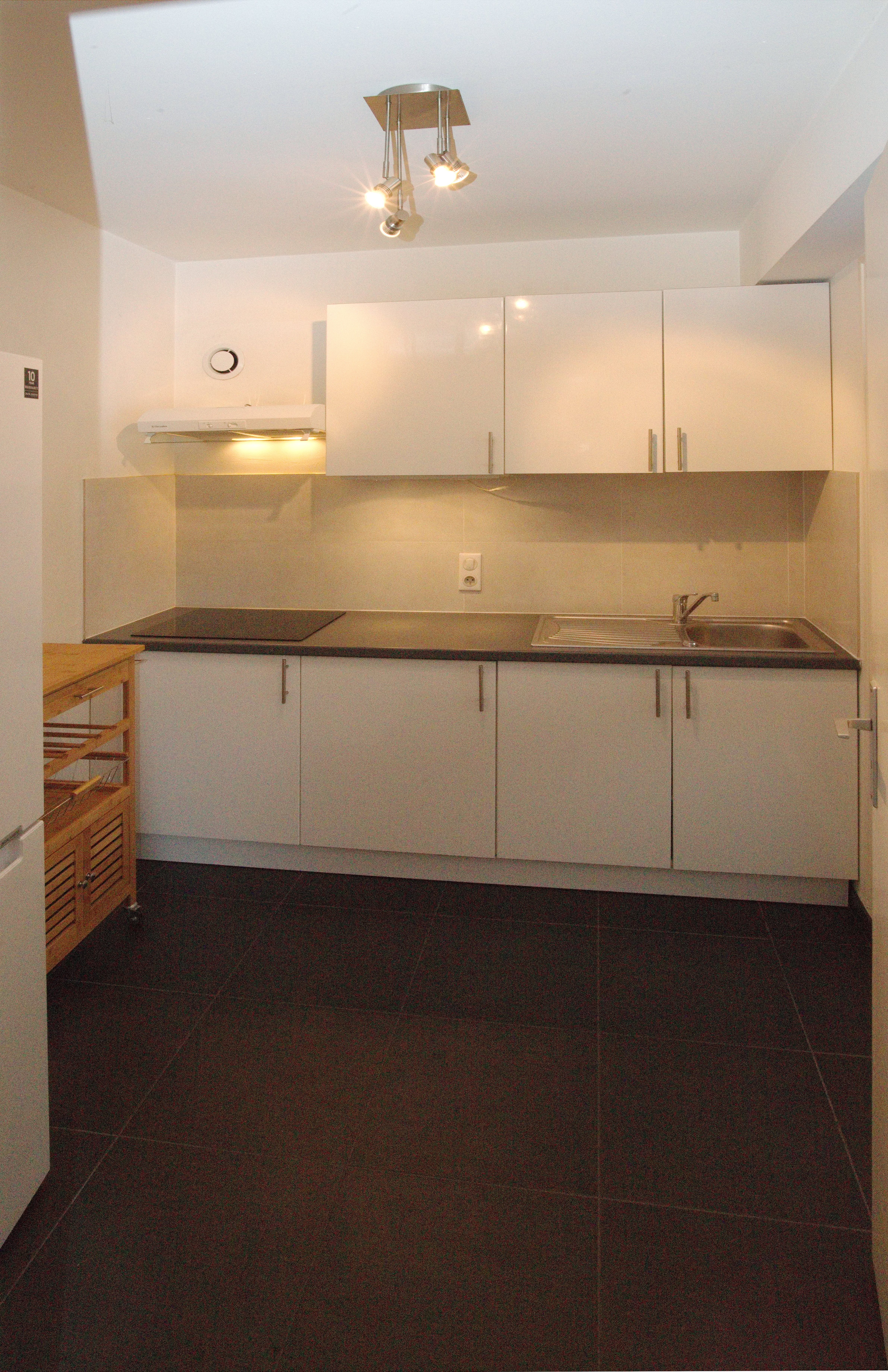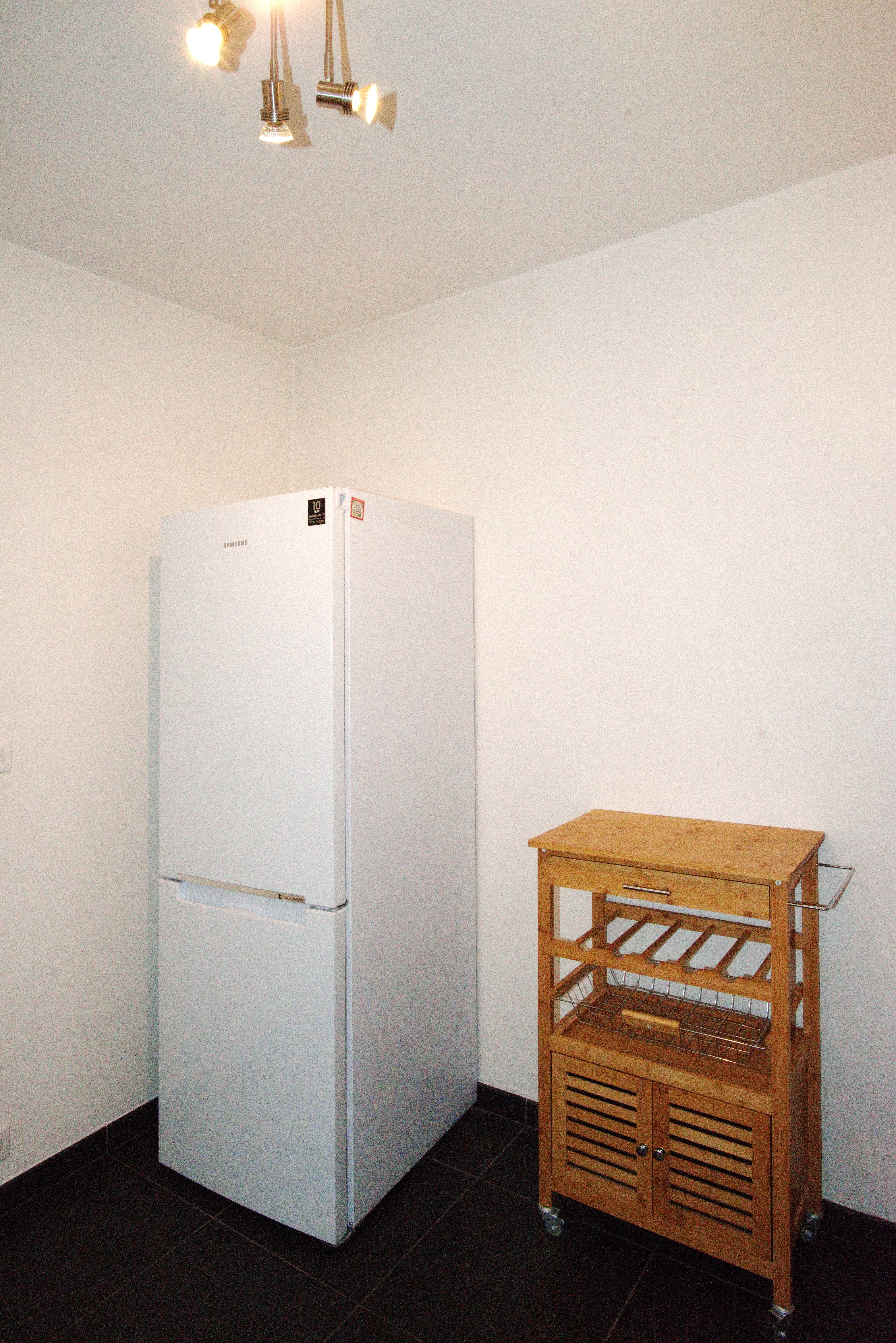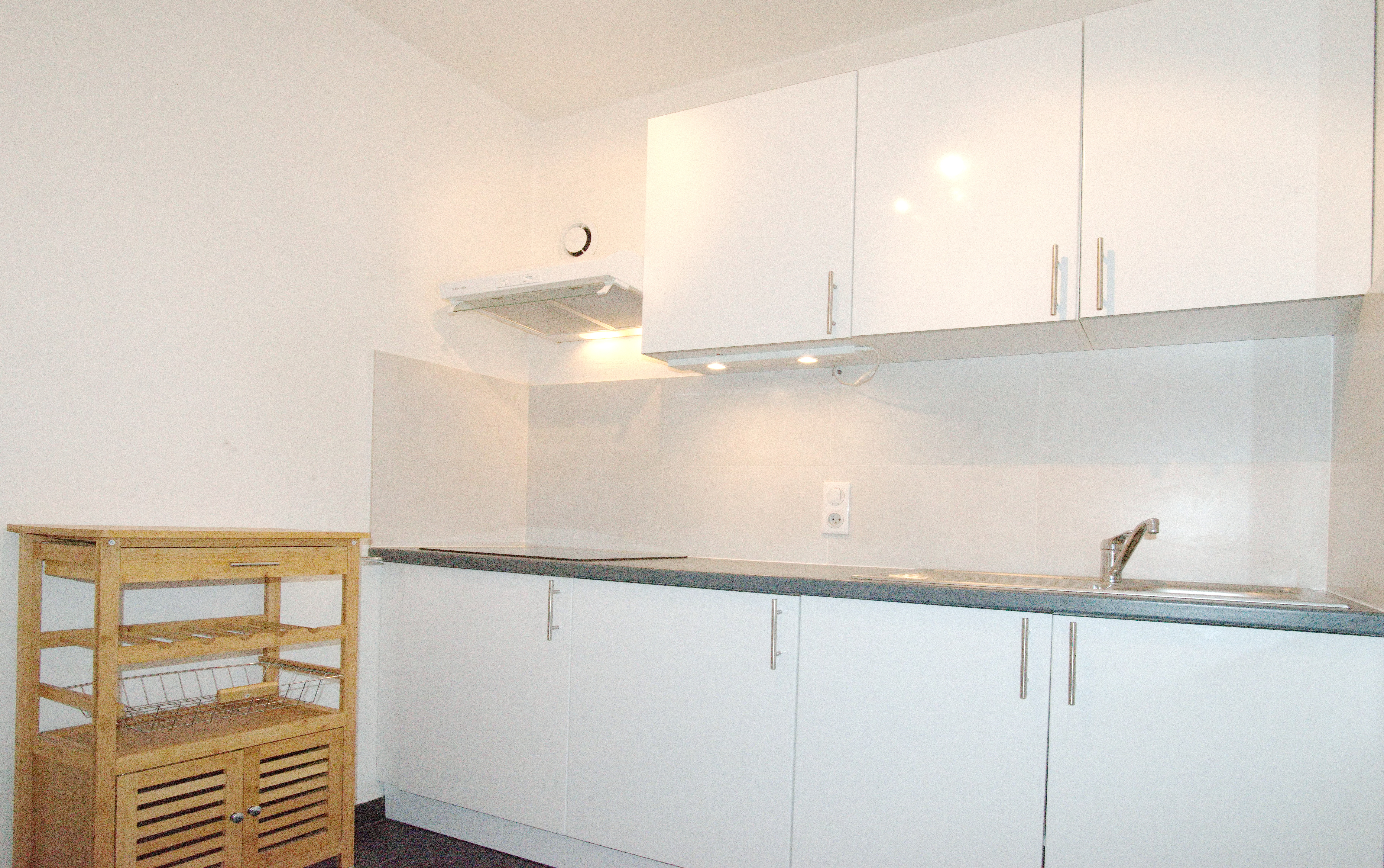 Cuisine équipée : réfrigérateur, congélateur, table de cuisson induction 3 plaques, four micro-onde, hotte aspirante, table et chaises pour 4 personnes, service vaisselle 4 personnes