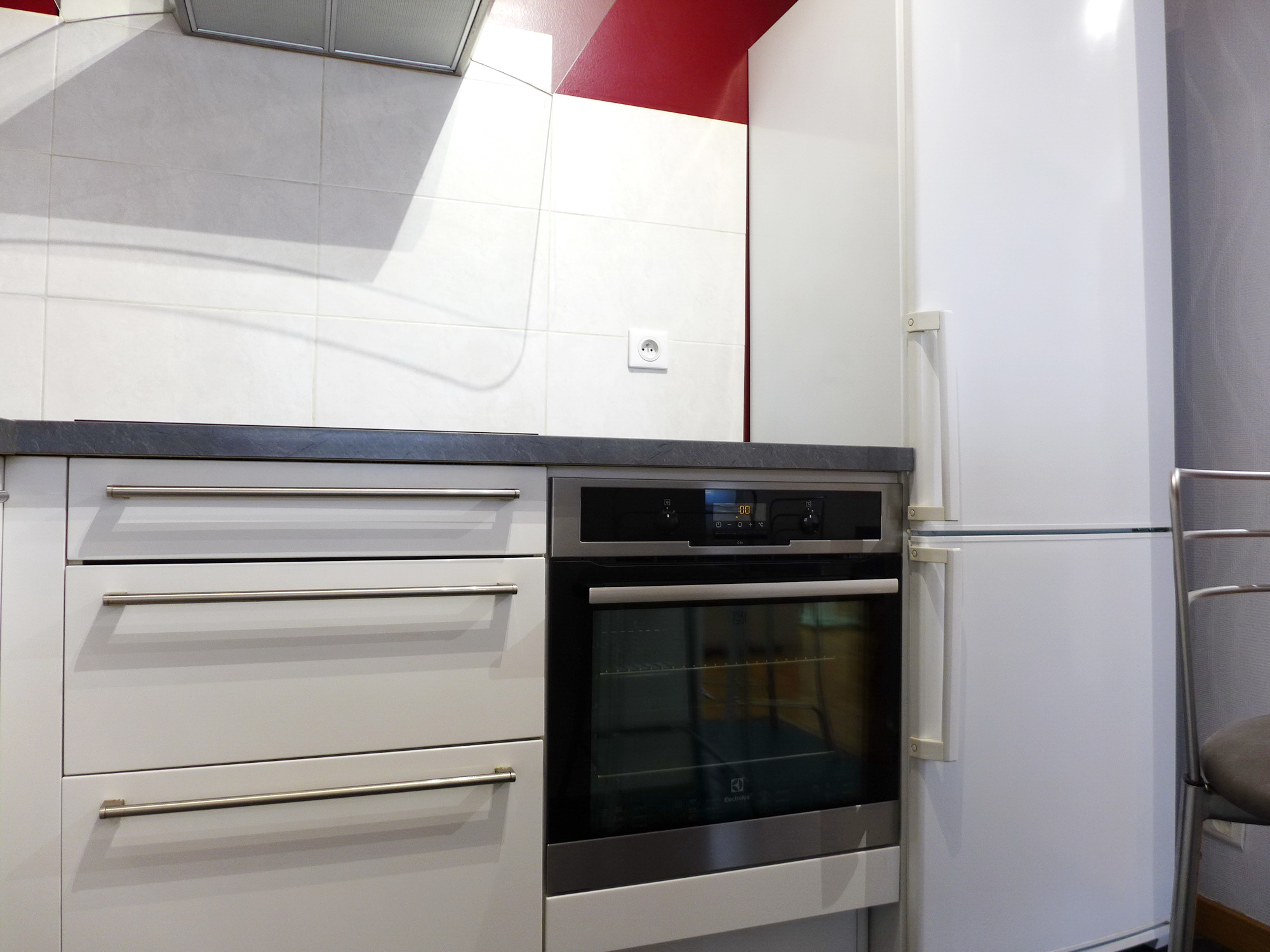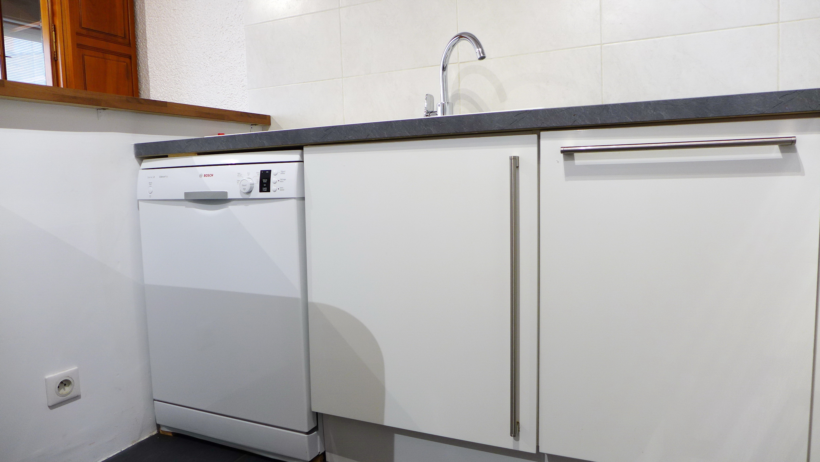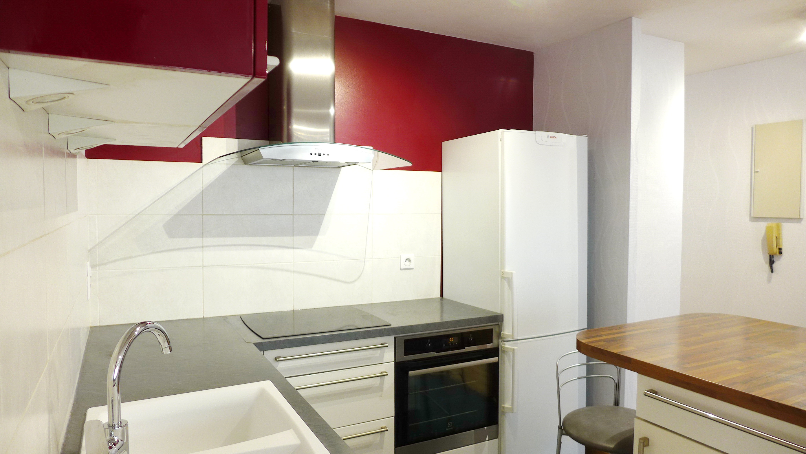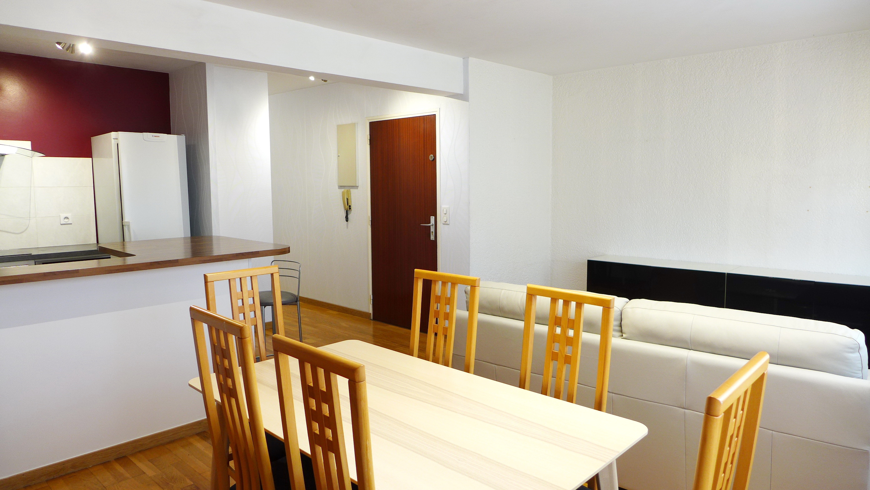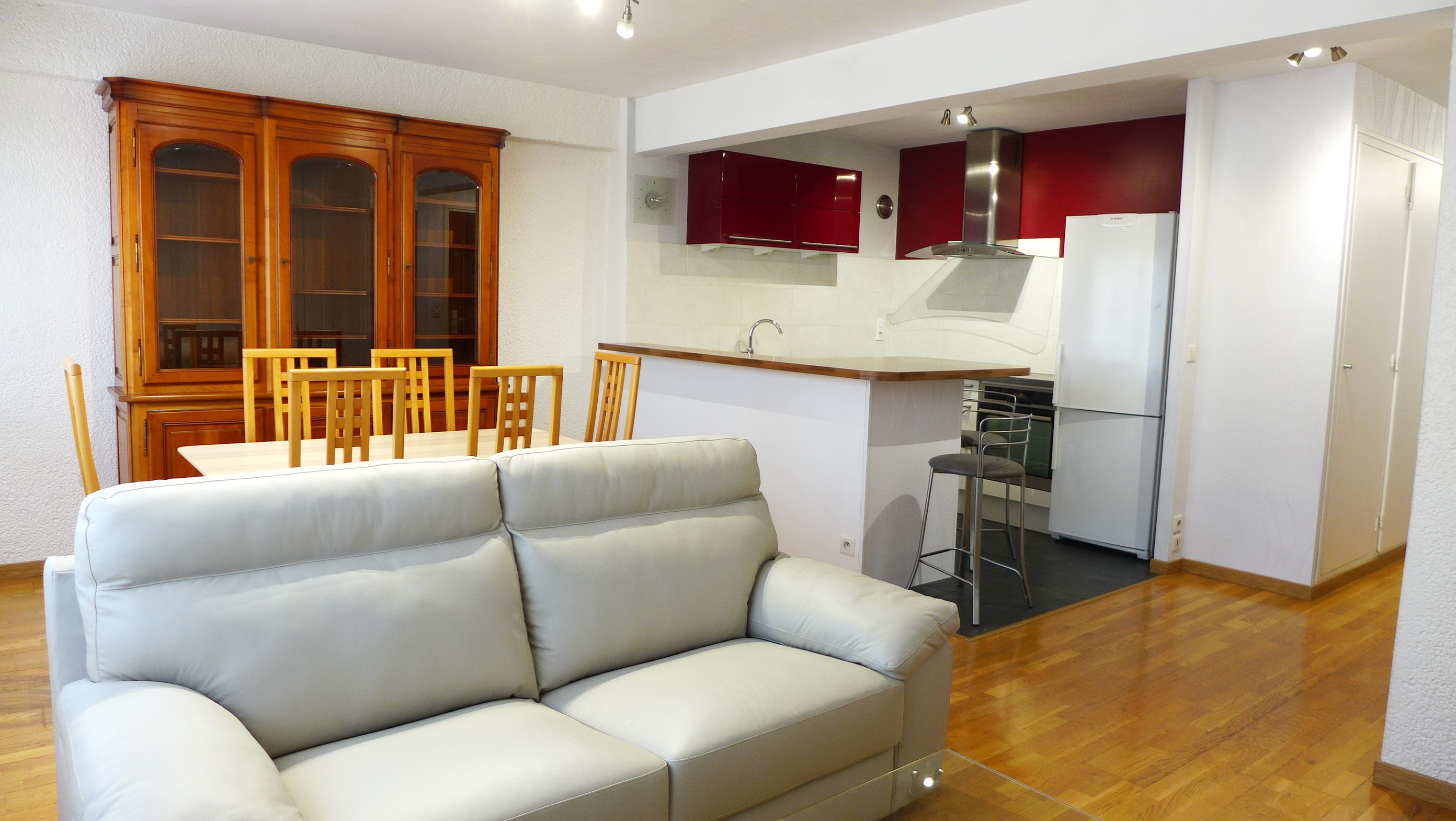 Cuisine équipée : lave vaisselle, réfrigérateur, congélateur, table de cuisson induction 3 plaques, four chaleur tournante à pyrolyse, four micro-onde, hotte aspirante, table et chaises pour 6 personnes, service vaisselle 6 personnes