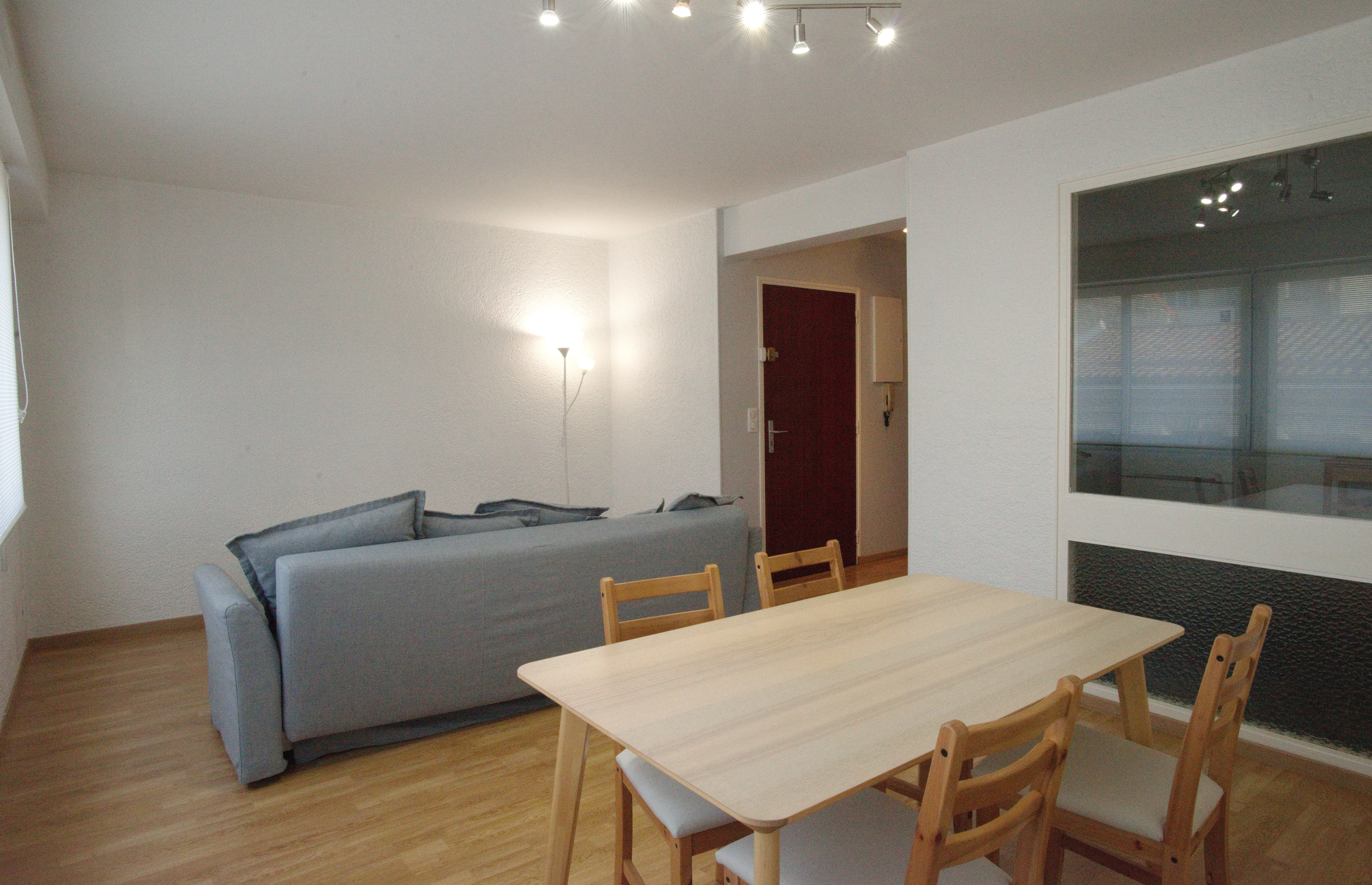 Cuisine équipée : réfrigérateur, congélateur, table de cuisson induction 3 plaques, four micro-onde, hotte aspirante, table et chaises pour 4 personnes, service vaisselle 4 personnes