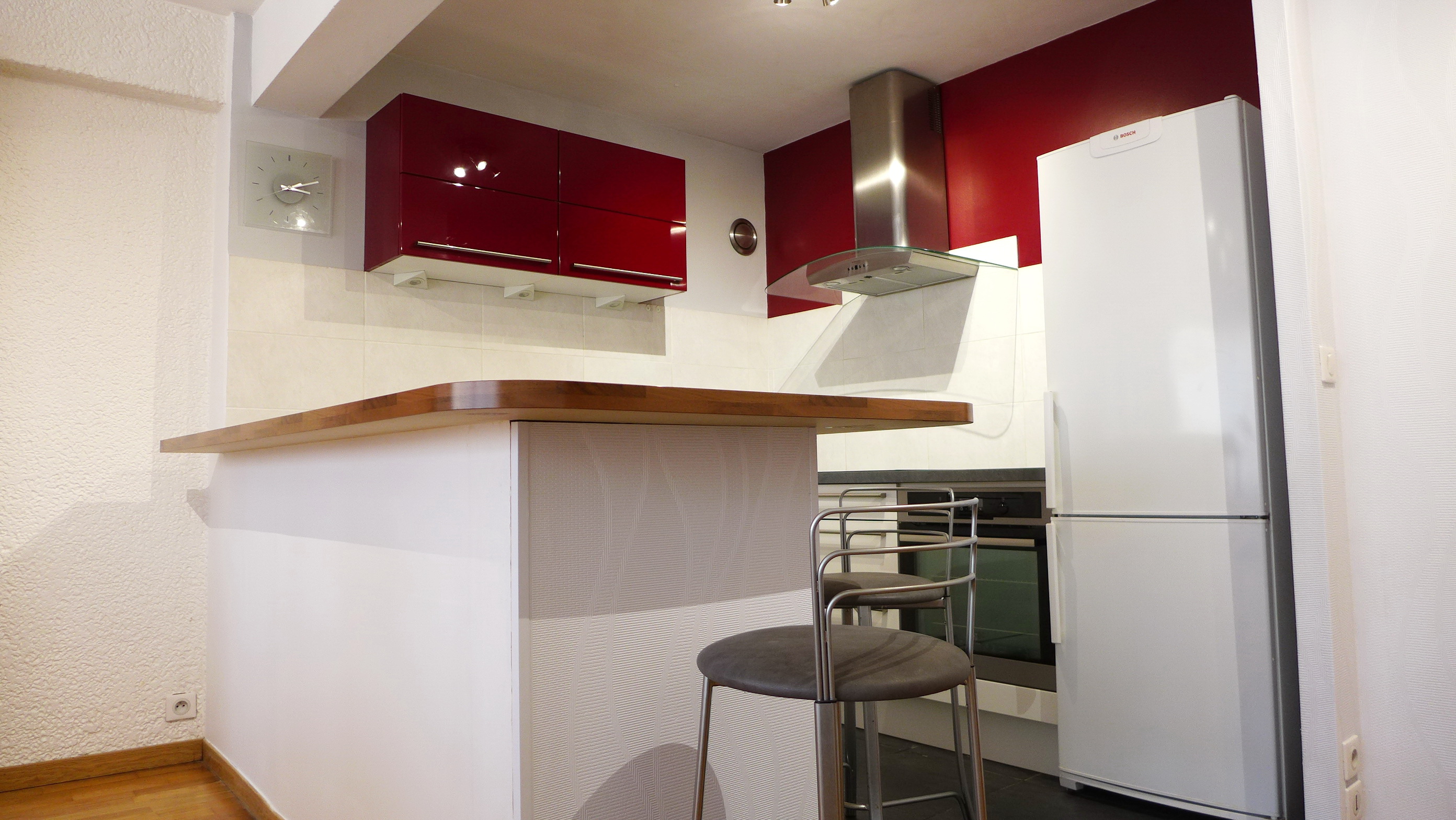 Cuisine équipée : lave vaisselle, réfrigérateur, congélateur, table de cuisson induction 3 plaques, four chaleur tournante à pyrolyse, four micro-onde, hotte aspirante, table et chaises pour 6 personnes, service vaisselle 6 personnes